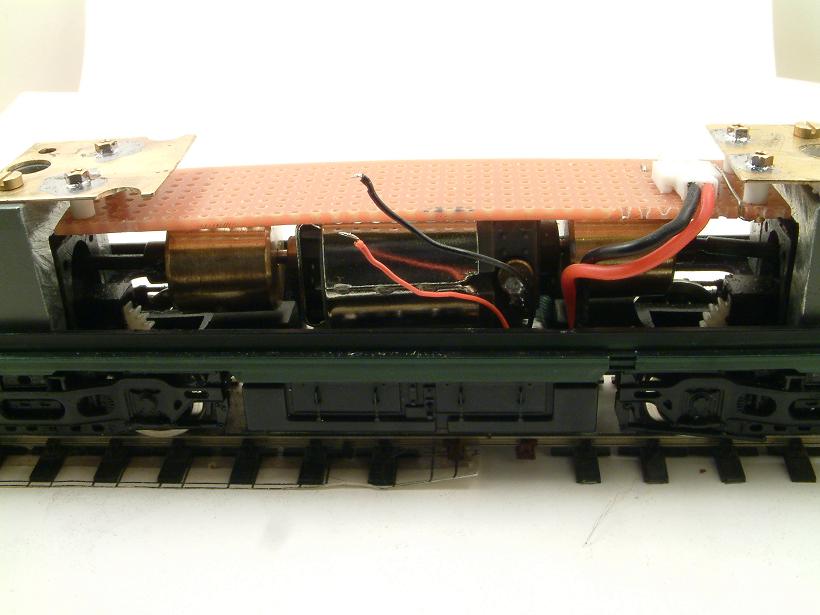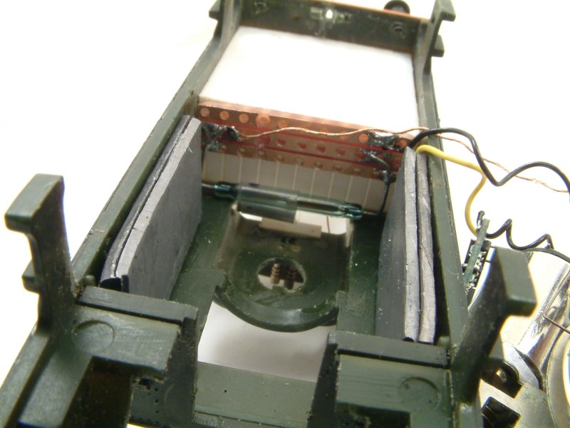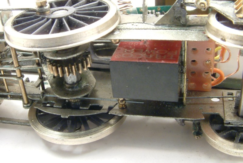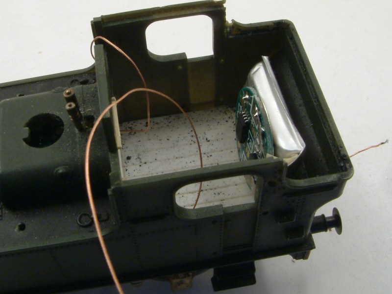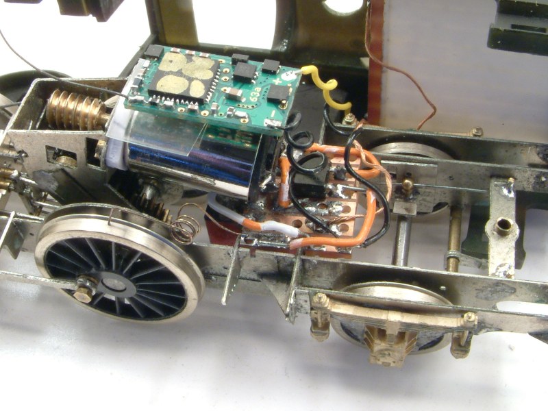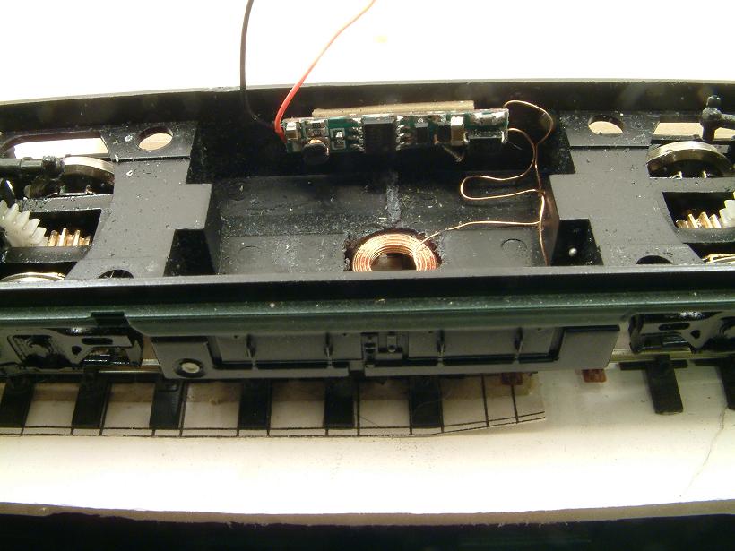 Bachmann Class 24The tanks of this Bachmann Class 24 have been cleaned up inside, and a hole drilled in the centre to allow the receiver coil to be glued in. The receiver pcb fits neatly against the side of the tanks, using double sided tape. The output from this pcb when the receiver coil is over an active transmitter coil is 5V DC at around 160mA, depending on the distance between the coils. This is the largest Li-Po battery that fits comfortably in the tanks space. Showing the distance between the transmitter coil in the track, and the receiver in the loco. This will be a little closer when the loco is weighted. The original motor mounted above the battery, held in place by the stripboard which replaces the centre of the original weight and motor mount. This modification allows space above for the radio receiver, voltage booster circuit and even a battery for later locos such as the Class 25s which had the water tanks removed. Some extra weight could be added if required, but this loco is fitted with Penbits sprung bogies, so compensating for the loss of weight with more efficient traction. Another view of the transmitter coil in the track, and the receiver in the loco. Populated stripboard, from left to right – Indicator LED, temporary, to show when the receiver coil is receiving; Magnetic latching reed switch, which isolates the next pcb, the voltage booster circuit. The white block under the reed is the battery connector. Then the voltage booster pcb, which supplies 12V power to the radio receiver, in this case a DT Rx61d-22. Fitting a 14xx 0-4-2TThough there may have been room for the induction receiver coil underneath, there is no space for the pcb unless I throw some of the weights out. Not really an option if I want it to pull anything more than one autocoach. This option demonstrates that induction isn't necessary, just desirable in some circumstances; there is even a 12V option coming, now that I have had a better look at what is available on eBay. This shows the motor, a 10x16 3.7V coreless, attached (superglue!) to a 60thou pad of styrene drilled and tapped 12BA in order to attach it to the High Level gearbox. Above it is fixed, via a pair of 30swg lengths of phosphor-bronze wire, the Rx63a-22 DT receiver. The view from underneath shows the voltage regulator between the frames, where the ashpan would be. This is superglued to a frame crossmember, and soldered into the stripboard. This ensures that no more than 5 volts is supplied to the battery control circuit board. The battery in this case is of 135mA capacity from Plantraco, and since it comes as a 'bare' cell it is protected from over charge or discharge by a control circuit. A large variety of add-on control circuits are available on eBay. The power package fits neatly in the very small bunker in the Collett tank loco. This piece of stripboard carries a latching reed switch, wired between the common input from the regulator/battery positive and the supply to the receiver. Some sort of switch is required to isolate the battery from any load, however small, to prevent unwanted discharge of the battery. © Ted Scannell