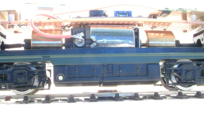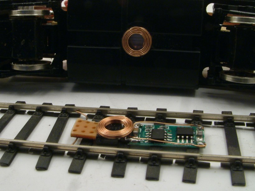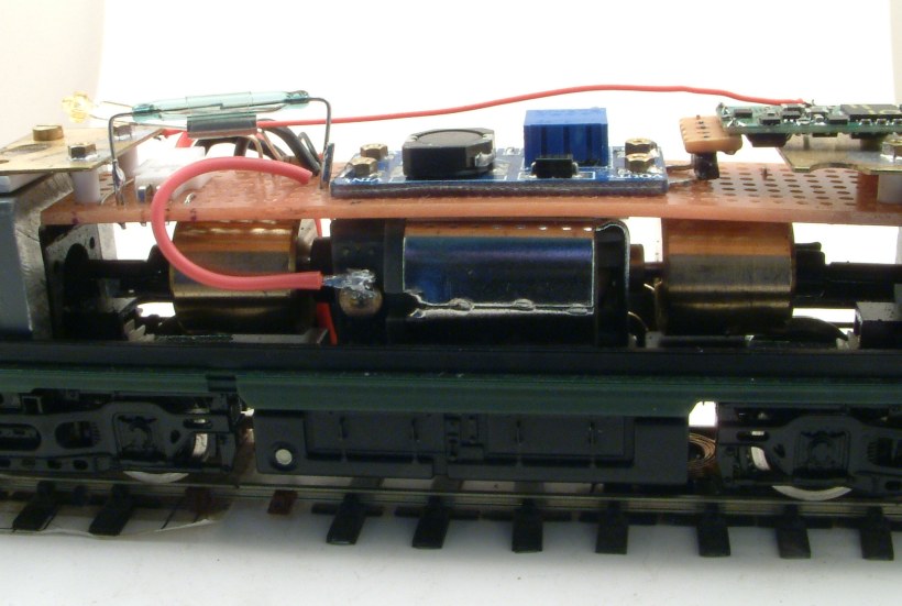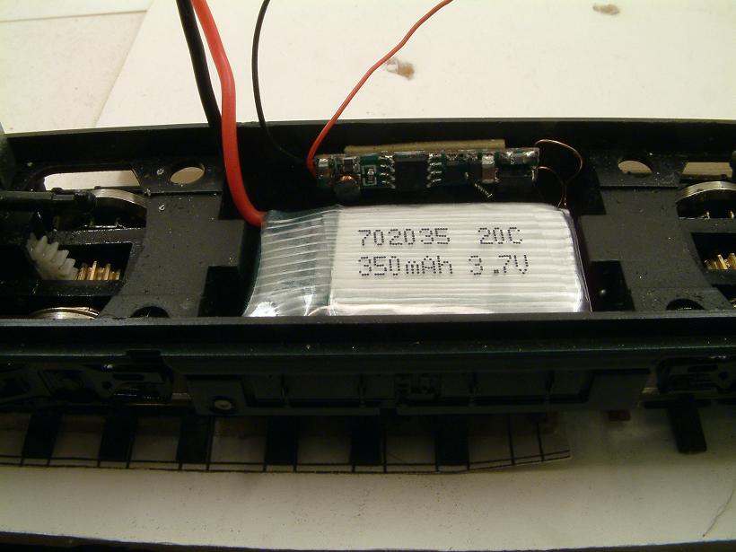 The pcb controls the balance of the charge to the three LiPo batteries attached to the connectors. It requires a 12.6V DC supply to the 'P' inputs to fully charge the batteries, the supply drawing in my testing so far a max of around 20mA. With the bridge it needs 14V AC or DC. Output is 12.7V DC max, (so far!) I have yet to drain it to find out the lowest it will go before switching off. If any (or all) of the batteries are disconnected and then reconnected, whatever the state of charge, no output will appear until an input is sensed and removed. The pcb is 50 x 16 x 3mm, but I have added a bridge rectifier to the inputs 'P' which make it a little longer and thicker. The inputs are also outputs, so the top pads are for the line to the Rx. The connectors on the stripboard came from the USB charger units that came with the battery packs bought on eBay. These are available in 250mA, 350mA, and 650mA capacities, the 350mA shown being about the same width as the pcb and stripboard. The batteries still have their own individual built-in protection circuits, so we are double-safe for the h&s nerds out there. I am currently paying £1.53 for each of these pcbs on eBay. Voltage boosterThis pcb, labelled icsa004a, uses the MT3608 chip which allows for the input from a single LiPo cell to be boosted to up to 24V at up to 2A. At 37 x 17 x 6mm, it is the same size as a 350mAh 'safe' battery. To work out the effect on the time the battery can supply, the demand from the motor needs to be calculated. Some draw quite a lot of current, but a typical commercial motor usually draws around 350mA, a coreless around a tenth of that. To calculate, the motor demand needs to be converted to watts. Watts is V x A, so the commercial motor above at full power and load will need 12 x 0.35, or just over 4W. The battery before the voltage boost delivers at a mean of 3.6V, so the draw on the battery will be 4.2/3.6, or 1.2A. It is therefore reasonable to expect a 350mAh battery to last for 350/1200 hours, or around 20 minutes. But remember, this is at full power and full load. Charging optionsFor traction units being converted that already have pickups fitted, they can be used with any normal supply, DC or DCC AC, by installing a bridge rectifier and a Traco 5V regulator. (Shown under the 14XX chassis below.) This can be permanently wired to the battery and will charge it when the internal controller requires it. These regulators are 'switched mode' and do not get hot like older regulators, so do not need a heat sink nor risk melting plastics. An alternative is to fit a connector for a feed from a USB port, which also provides a 5V DC supply, but of course tethers the unit during charging. Induction charging is a further option. This is the same technology as the charger for an electric toothbrush. That shown consists of a transmitter coil and pcb, which requires a 10V DC supply. A number of these can be installed with their own supply, or the alternative as shown is fitted with a bridge rectifier and phosphor bronze wire pickups sprung between the rails. The transmitter coil does get warm, up to 45°C, but that is lower, just, than pain level, and is no threat to the models or the track. The receiver coil needs to be fitted as close as possible to the transmitter, in the case shown just lower than the bottom of the fuel/water tanks on a Class 24. The transmitter coil tested is 1mm above rail level, with an air gap of some 1.5mm, which gives a reasonable rate of charge. Any combination, or all of the above, can be wired directly to the battery positive conductor in the traction unit, and that to the input connections of the booster pcb. The battery internal controller will usually limit the charge rate to around 160mA in the batteries tested so far, which offers a guide to the time taken to charge a fully discharged battery, but as they retain charge very well, this is unlikely to be a serious consideration in normal use, unless tethered charging is chosen as the only option. Radio receiver/controllerThere are a number of options on the market, well detailed on The Dead Rail Society The receiver in the Bachmann Class 24 shown below is a British version, a Deltang Rx61d. These, or the later and recommended Rx62 are available from Micron Radio Control. As pointed out on the Dead Rail Society page, the Deltang website can feel a bit obscure, but lists the many control variables available within the receivers, and good further information is available there.
