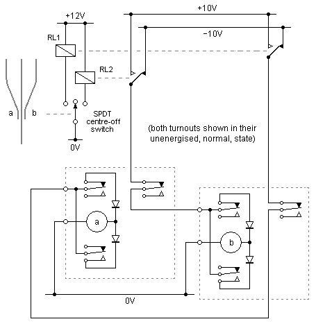 A single potential supply connects via a DPDT switch to the point motor. The point motor will operate irrespective of the polarity of the supply. In the diagrams below however, a particular polarity is used to show how the point motor operates.