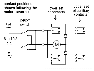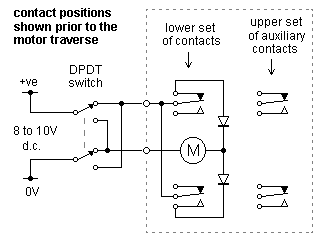 The lower set of contacts are the limit switches, and cut the supply to the motor when it has finished its traverse. The upper auxiliary set of contacts operate slightly before the lower set.