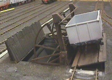 A selection of pictures showing the coal wagon tippler in the industrial sidings (plus a few wagons of course). It was scratchbuilt in metal by Peter Wilson, and works. Each incoming full coal wagon is uncoupled and placed on the tippler, which then rolls the wagon over slowly and tips its contents (we use real coal) down the chute. The boring part of the operation is filling all the wagons up again in the fiddle yard. We haven't managed to automate that process yet.