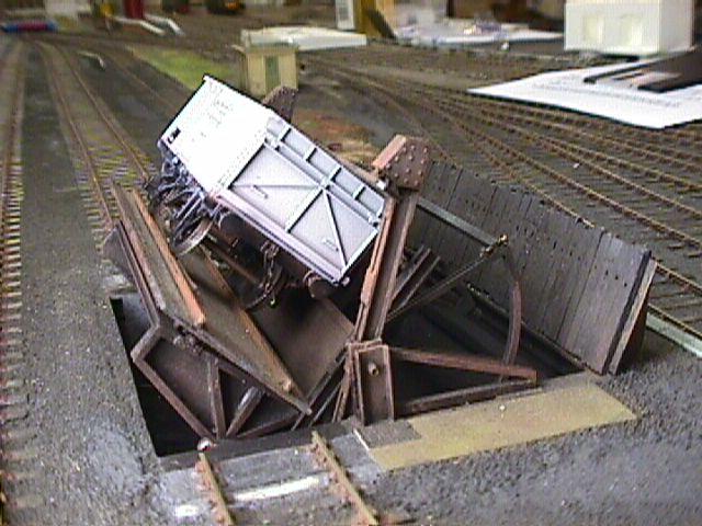 Base The base is made from sheet brass and milled sections. I made a frame, right-angled in section, which is a push fit in the hole in the baseboard. The vertical component of the frame is deep enough to cover the thickness of the baseboard timber. On the horizontal components, at each end, is a bracketed post for the main pivots. To the rear of the base is fixed an angled sheet, lined with double thickness second hand sleepers. This guides t'coal into t'hole. Platform In its normal position the platform sits just below the ballast so that the rails are level with the fixed rails on either side. At its outer side, the platform is pivoted to a girder structure, and on its inner side it rests on the base. The girder structure passes backwards and upwards through the main pivot point. About halfway up the vertical parts of the girders is a beam, which is free to swivel. Above and behind the pivot point, the girders, on either side, curve to form two quadrants, which are braced to the vertical parts. There is also some horizontal bracing between the side components. The quadrants are of U section in the cavity of which sit a chain. The chains are fixed to the girders at the top and pass down through the chute to a capstan below. I made the platform of thin brass sheet, heavily embossed with rivets, and printed circuit board, forming a sandwich. As the rails carry current, the two halves of the top are separate and carry the rails. The rest of the platform structure uses various sizes of milled brass section and is best seen in the photographs. The chain is something that I used to make for a living and is of silver. Electrical connections are made to the two upper halves of the platform and the wires pass down through the front of the chute. The beam, which is hinged to the vertical girders, is to steady the wagon during the tippling process. It is not to be confused with the main beam, which will be described next. Beam The beam has the function of clamping the wagon to the rails during the tipping sequence. A massive beam, probably 9" by 18" in section, is fixed to a girder structure. The girder structure has heavy weights fixed to it below ground level and the complete assembly is free to rotate on the same pivot pins as the platform. Milled brass sections were used to make the beam and girder construct, with lead for the weights. The verticals are pivoted on the outside of the platform supports. All the parts were riveted to give the impression of great strength. Motor and gearbox A Tenshodo motor with a gearbox drives the capstan, and some electrical circuitry enables the speed to be varied from real time to exhibition time. The reason is that at the correct normal speed, not a lot of movement is seen, and the viewers will find their attention span under threat. I think the gearbox gives about 80:1 reduction, but, as mentioned before, the speed is set electrically. There are three speed settings. Tony Wilkins did the electrical work, thank the Lord. Micro-switches control the limit of movement in each direction, with a slight over run on the way down to ensure that the track is lined up. The capstan was made from Meccano parts. Chute A pyramid-shaped chute was made from some tin boxes and fixed permanently to the underside of the baseboard. The screw-top lid of a jar was soldered to the lower end of the chute. A plastic jar, big enough for about sixteen hundred tons of coal, screws onto the lid, and can be quickly changed when full. The lifting chains pass down through the front of the chute and wrap round a capstan fixed outside the chute. Assembly The frame, chute, motor and gearbox were fixed to the underside of the baseboard, and the main parts, the platform and the beam to the frame. The wires for the track power and the driving chains were fed through the front of the chute and attached to the motor and capstan. Power was connected and tested. Action A loaded wagon is shunted on to the platform, just clearing the small hinged beam. The train is then withdrawn. The motor is switched on and drives the capstan, winding in the chain. This causes the girder and platform assembly to begin rotating around the pivot points. Because the platform was supported on the 'near side' by the base, and on the 'off side' by the hinge; as it lifts, it will tilt sideways, causing the wagon to come into contact with the first beam. This small contact is enough to steady and brake the wagon in place. When the assembly has moved about fifty degrees, the top of the wagon comes into contact with the main beam. The resistance to movement caused by the weights attached to the beam, cause the beam to clamp the wagon to the rail, but, as the beam is pivoted about the same axis as the platform, it now turns with the wagon, while maintaining the pressure. This pressure holds the wagon to the rail throughout the movement. At this point the capstan is lifting the whole assembly and the wagon! After a movement of about one hundred degrees, the load has tipped out of the wagon and the tippler is returned to the down position. The empty wagon is now shunted off the platform. © Peter Wilson
