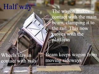 The problems arise when we try to model all these movements. At first I thought that Alex Jackson couplers would take care of everything. In fact I put a very small permanent magnet inside a box on the lower side of the platform and it activates the AJs very well. But the logic is flawed. The first movement is fine. The train pushes back and the last wagon is uncoupled by the magnet. The train pulls forward and the tippler does its thing. However, when the train returns to push the now empty wagon off the platform, the wagon re-couples to the train. Such is the nature of AJs. At first it seems that a second magnet, just past the platform, would solve the problem by uncoupling the first wagon again. It will, but, by this time the second wagon, which has fully crossed the platform, has uncoupled itself whilst passing over the first magnet. It cannot now be pulled back to the centre of the platform. If one could put electromagnets onto the platform it would solve the problem, but of course you cannot. To be honest I do not know what the answer is. For now we are using 3-link couplings, but it is a bit of a pain by the end of a long running session. If anyone has any ideas on the subject, I will welcome them. The tippler can be divided into five discrete parts: